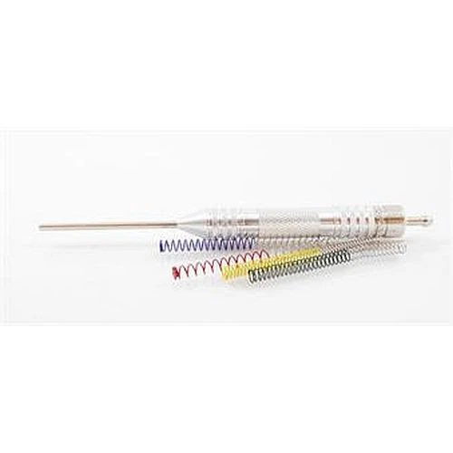 The Tsumo-Shin Acpuncture Probe for Children has a spring function which allows for the pressure to be adjusted. There are a total of five interchangeable springs contained in the set each with different pressure strength. The probe itself has a smooth rounded tip and the handle has a finely knurled finish that allows the practitioner to have a precise grip.